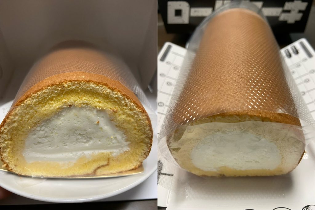 米粉のロールケーキ生地はどちらも しっかりしっとりで同じ感じ生クリームは 左側の方が好みでした