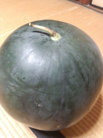 お盆に実家に帰ったときにありました。 黒スイカ!!!!! っていうそうです。 畑で採れたそうですが、なにせでかい☆彡 写真では、あまりでかさ具合がわからずがっかりですが・・・・・