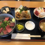 久しぶりにまぐろを満喫してきました。まぐろをふんだんに使った、にぎわい丼です。つけマグロ丼・まぐろの唐揚げ・まぐろのカルパッチョと結構な量でした。これで1280円なので十分満足です。